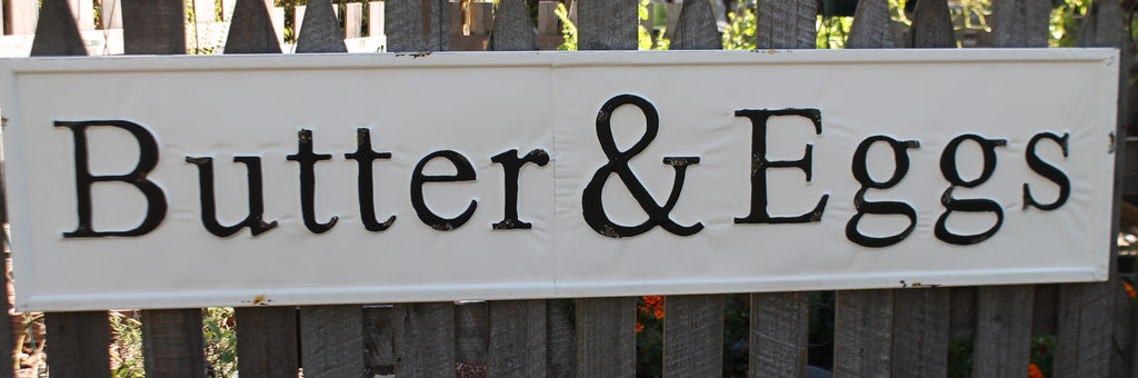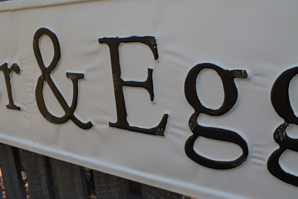 Huge 57" Vintage Inspired Embossed Metal BUTTER & EGGS Sign