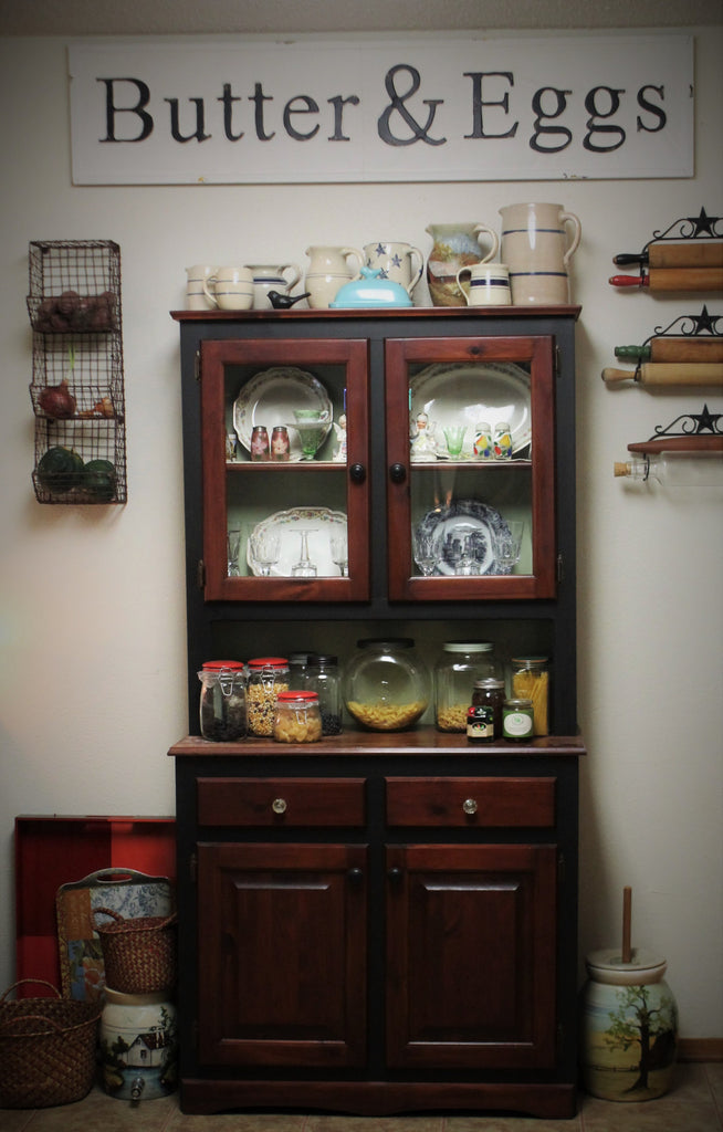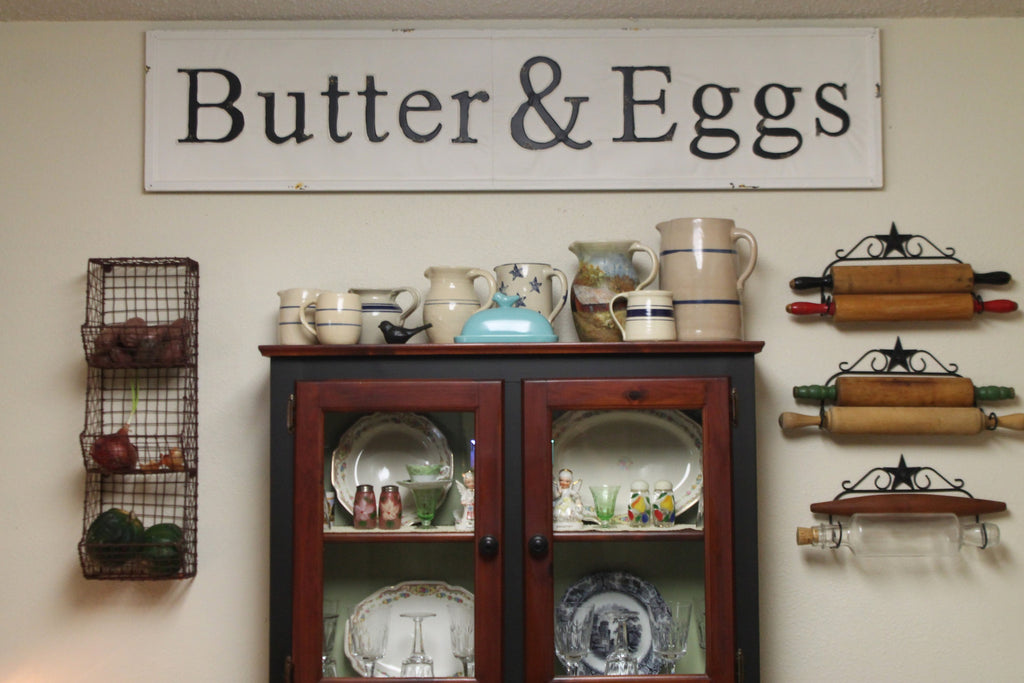 Now we can finally utilize and beautify those ugly, bare above-the-cabinet soffit spaces! Our huge black block lettering on creamy white metal BUTTER & EGGS sign measures 57" long, 12.5" wide and .75" deep from the wall.