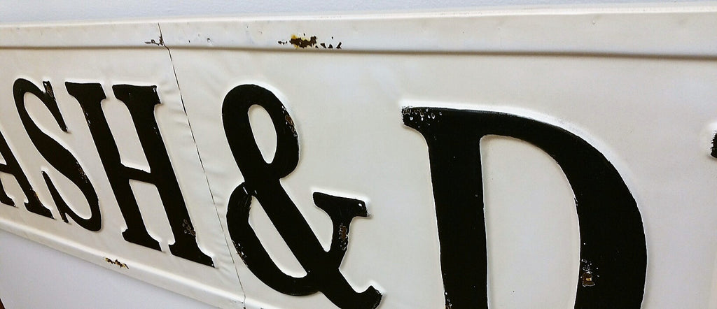 Our fabulous vintage industrial inspired WASH & DRY sign is huge! Featuring antique black block lettering embossed on creamy white metal, Sign measures 58" long, 13" wide and 1.18" deep from the wall. Sturdy keyhole mounting brackets for wall mounting (mounting hardware is included), or just prop this beauty up against a wall!
