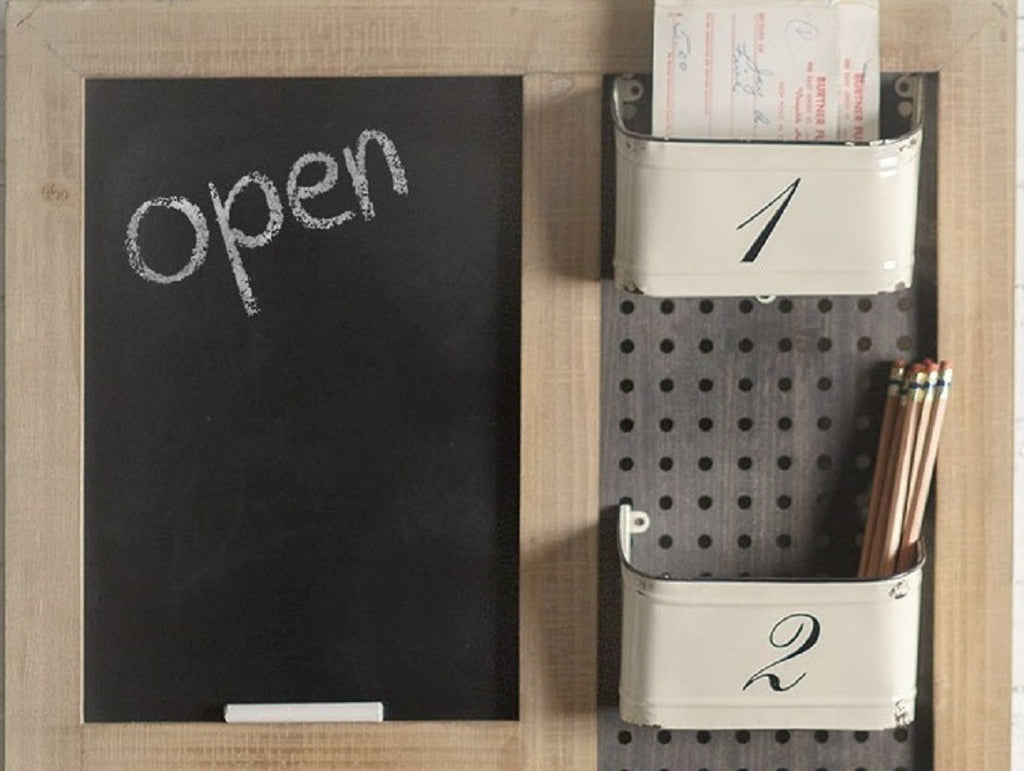 Measuring a large 24¾ inches tall, 4½ inches deep and 20 inches wide, we have the perfect 'command center' for your home or office! Our natural wood frame chalkboard orgaizer boasts a "rustic loft meets modern farmhouse" vibe with its pegboard panel and enamel metal bins! Lidded MAIL bin and three smaller numbered 1, 2, 3 bins corral all your notes, mail and to-do's, and works as perfectly in the entryway, crafts or laundry room as it does in the home office or kitchen!