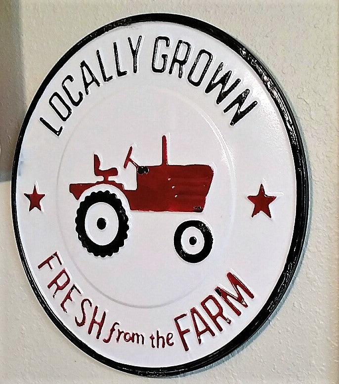 This round metal sign is just awesome! Perfect for a sliver of blank wall space in your kitchen or pantry, or to attract customers to your booth at your farmer's market! That red tractor is just use it on your greenhouse or door to advertise your veggies for sale! Attract the customers to your booth at your local farmer's market!