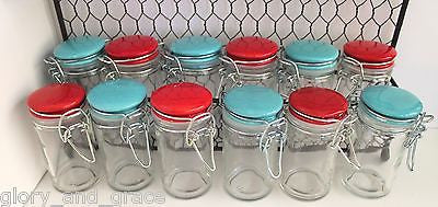 6 red and 6 aqua ceramic topped glass spice jars are included.