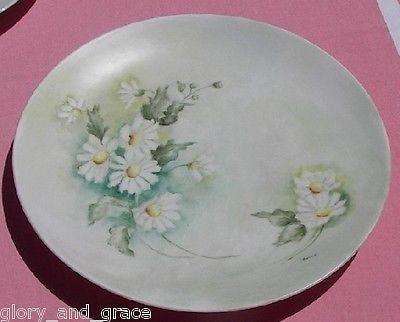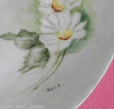Handpainted Bareuther German porcelain plate has absolutely stunning shadings in the softest greens, blues and yellows, with stems of sweet shasta daisies. Artist signed, "Rose F" (Rose Fulkerson).