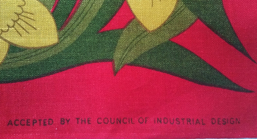 Bold mid-century florals against a deep orange-red background surround the center Ich Dien feathered crest of this new old stock tea towel. The crest is the traditional Prince of Wales motto, meaning "I Serve". 100% Linen.